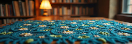 Handcrafted blue wool embroidery on wooden table with lamp and bookshelf in background. That the image is generated using AI.