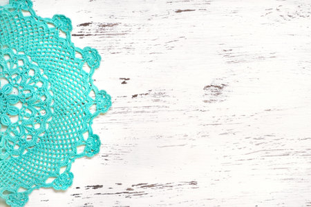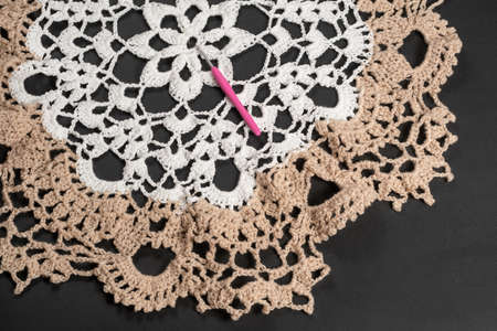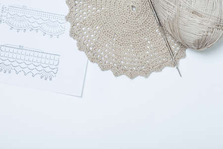 Small round handmade crocheted tablecloth, crocheted lace border, crochet hook and plenty of copy spaces for your inscription. Suitable for needlework blog.