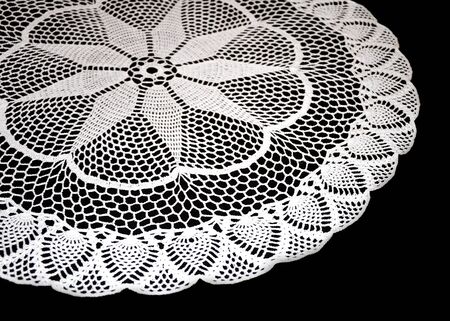 A part of isolated crocheted white doily with a mesh pattern with cones and arches a black background. Round decorative cotton doily. Side view