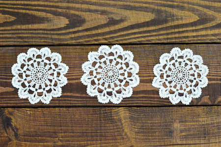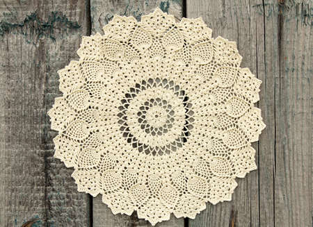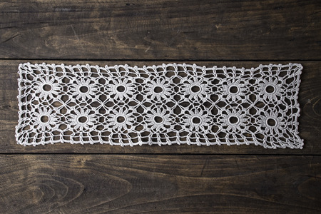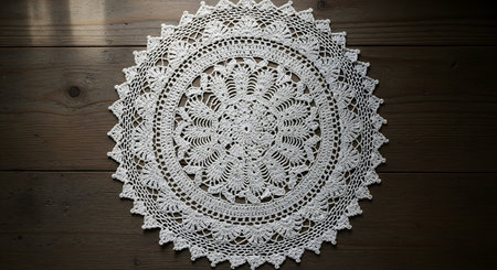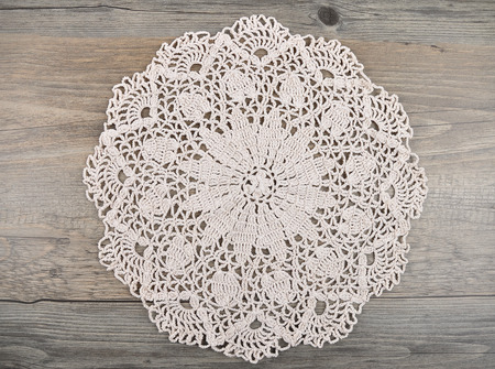 An intricate, handmade white lace doily is laid flat on a dark, rustic wooden table, viewed from directly above. The delicate, circular pattern of the crochet work contrasts beautifully with the rough texture of the wood, creating a vintage and nostalgic feeling.