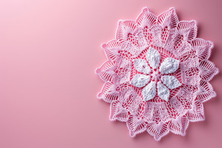 This image features a delicate lace doily set against a soft pink background, emphasizing intricate patterns and textures ideal for decoration or artistic projects.
