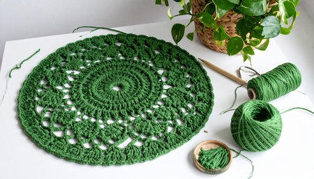 An emerald textured background with a delicate, crochet pattern. The intricate loops and rich green hues add a handmade, vintage charm.