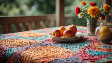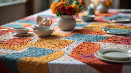 a table adorned with a white cloth showcases a striking arrangement of a blue cup and red and white plates. this contemporary quilt-inspired display, captured with the olympus mzuiko digital ed 45mm f/1.2 pro lens, exudes a rustic americana vibe. the handcrafted designs feature a fusion of light amber and red hues, reminiscent of the bold and aggressive quilting style popularized by donald judd. ai
