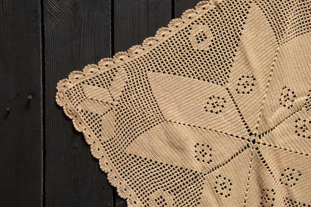 Fragment of a vintage napkin, tied with white thread, on a wooden table. Copy space, mock up