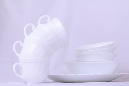 Stacking white porcelain cups for tea and coffee with plates