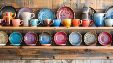 Capture handmade ceramic tableware. Explore studio pottery and contemporary stoneware design displayed on wooden shelf. Uncover handcrafted ceramics, bowls, mugs, plates, cups and artisan design. AI Generative AI generated