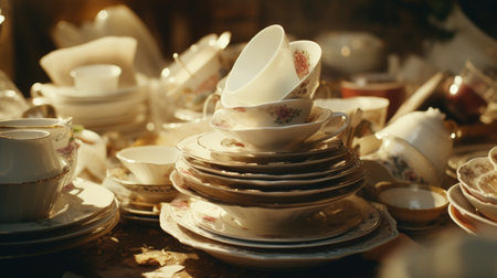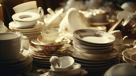 Pile Of White Dishes On The Table. Сoncept Nature Landscape, Candid Moments, Artistic Reflections, Urban Street Scenes, Dramatic Lighting