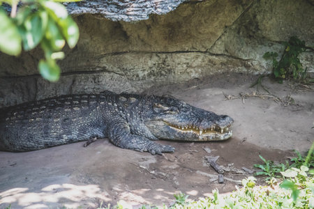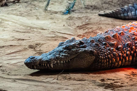 Crocodile lying on the sand in the sun shade