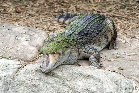 Mouth gaping while basking under the afternoon sun, Siamese Crocodile, Crocodylus siamensis, Thailand