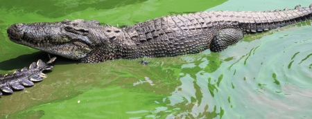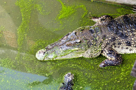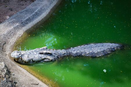 Big alligator crocodile lying in the pond of the zoo background