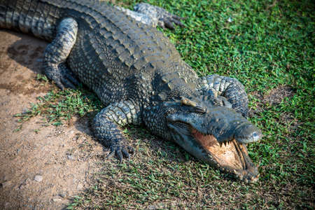 Crocodile opening the mouth resting on the grass