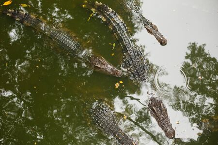 Wildlife Life. A group of alligators or crocodiles swim in a pond or in a river with green water. Crocodile farm.