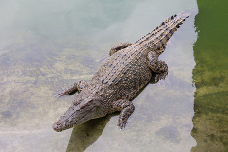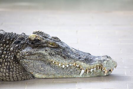 Large freshwater crocodile Sunbathing by the pool.