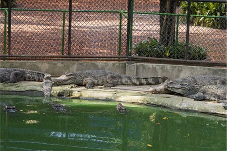 crocodile in the Zoo. Many alligator in farm show. crocodiles and alligators rests on the shore near the lake.