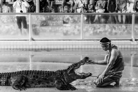 Pattaya, Thailand - December 7, 2009: Pattaya Crocodile Farm Show. Performer puts his hand in crocodile's mouth. Black and white photography