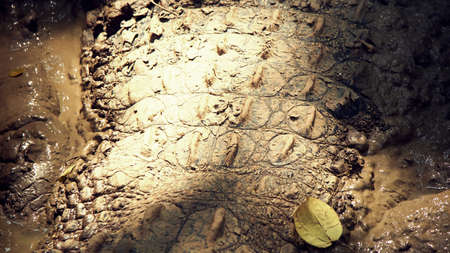 Top view of Saltwater crocodile top skin (Crocodylus porosus) or Buaya muara or Indo Australian crocodile or Man-eater crocodile. sunbathing at the swamp zoo.