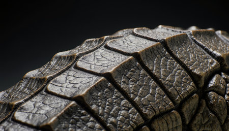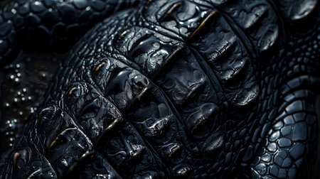 Intricate patterns on alligator skin reveal a detailed landscape of scales. The dramatic lighting enhances the textures, showcasing nature's artistry in a close-up view.
