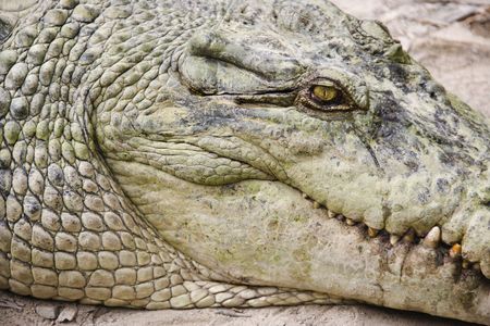 The cold calculating yellow eye of a reptile (crocodile, dragon, dinosaur). Muzzle of a crocodile lying on the ground close-up. The look of a reptile.