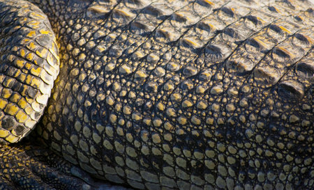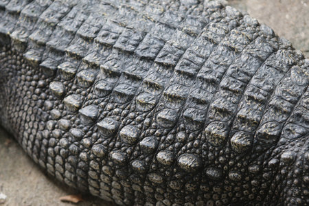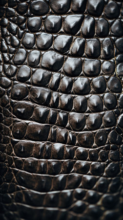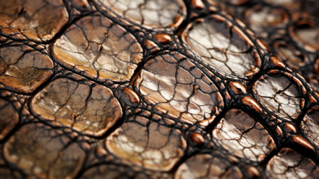 A close-up of crocodile skin texture, emphasizing the intricate patterns and rugged surface. The image highlights the detailed structure of the scales, showcasing the uniqueness of reptilian skin.