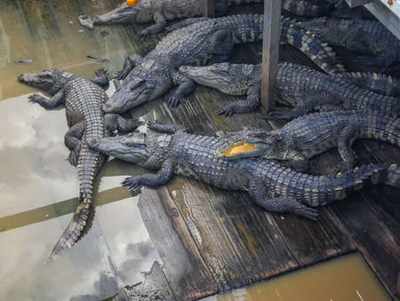 Crocodiles chilling out on the Sun at breeding farm in Siem Reap, Cambodia