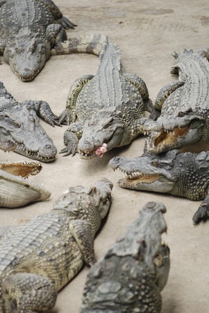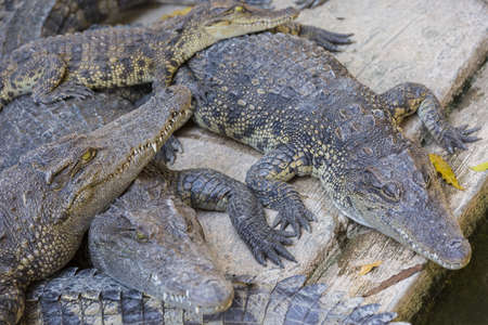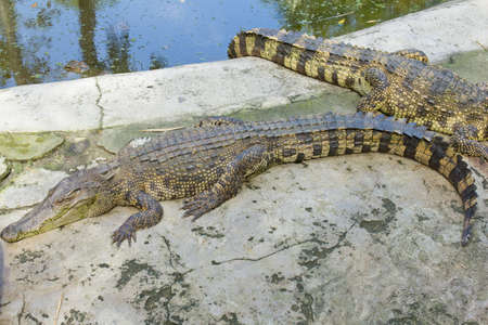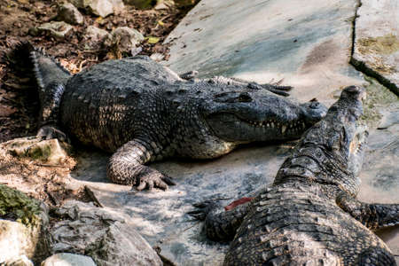Asian crocodile feeding meat sleep in outdoor farm and open zoo