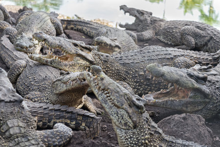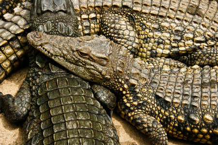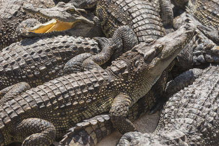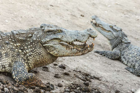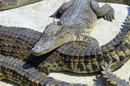 African Nile crocodiles resting, Crocodylus niloticus species native in Africa.
