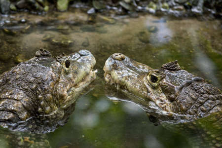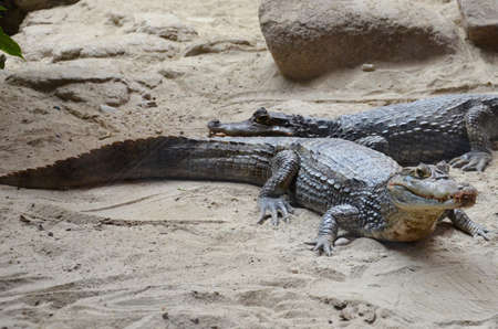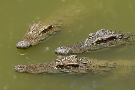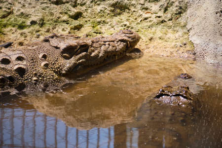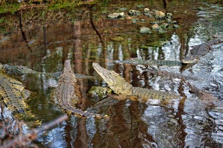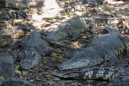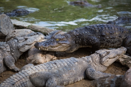 Cuban crocodiles resting, waiting for food in the breeding farm