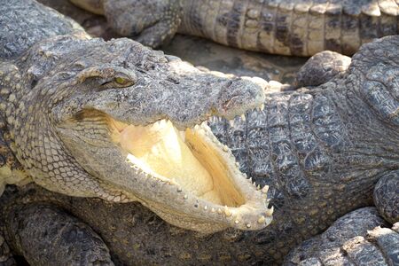 Crocodiles on a crocodile farm. Predatory reptile crocodile.