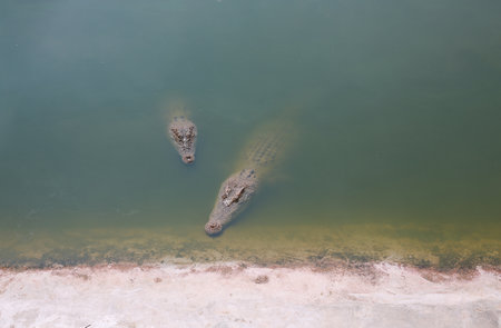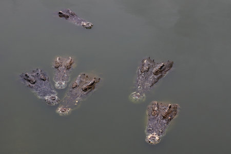 A captivating overhead view of a group of crocodiles swimming in their natural habitat, showcasing their distinctive features and behaviors in the wild.