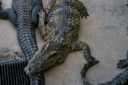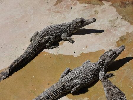 Crocodile basking in the sun, on a concrete surface, top view, close-up, crocodile farm, crocodile farming.