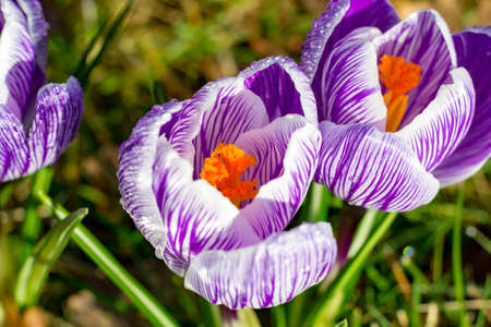 Purple crocus flowers with orange pistils opening in a garden during springtime