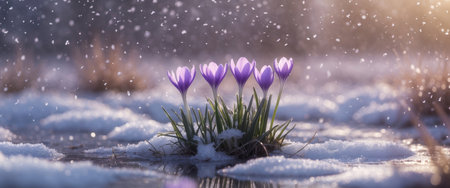 A cluster of vibrant purple crocuses emerges from a blanket of glistening snow, illuminated by soft sunlight. This enchanting scene captures the resilience of nature, showcasing the beauty of springs first flowers breaking through winters chill.