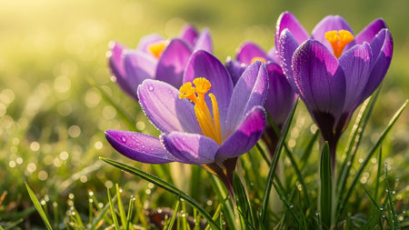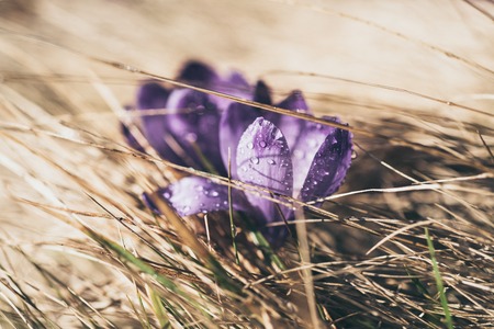 Beautiful crocuses with dew drops on the petals