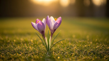 Beautiful crocus flowers in the grass at sunset. Spring time