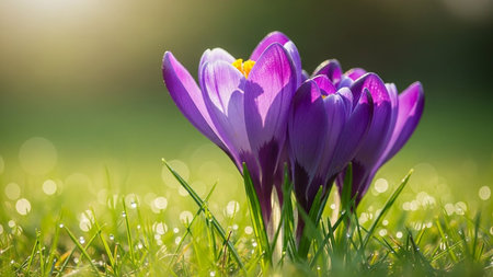 Purple crocus flowers in green grass, awakening in spring green grass in a sunny day. Blooming springtime. Soft selective focus. Copy space.