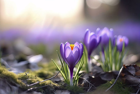 Beautiful purple crocus flowers in the sunlight. First spring flowers.