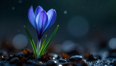 Single purple crocus flower emerging in dark natural light