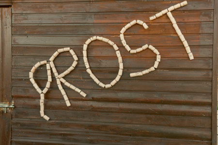 Photo of a wooden wall with the word “Prost†creatively spelled out using wine corks. Warm autumn light highlights the rustic texture and cozy vineyard atmosphere.