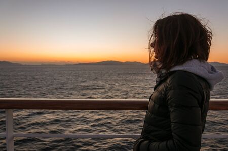 Girl watching a beautiful sunset from the deck of a cruise ship