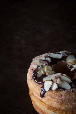 Rustic Cronut with Chocolate and Almonds on a Dark Rustic Background with Copy Space Vertical