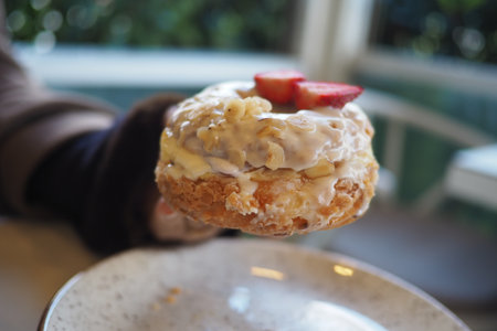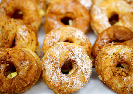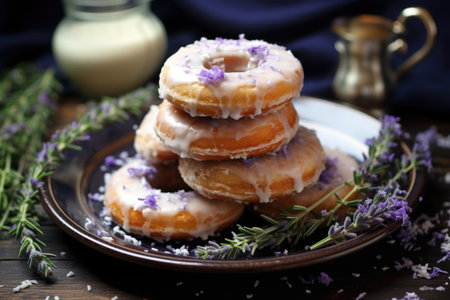 close-up shot of donuts with pearl sugar and blueberry glaze, created with generative ai
