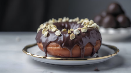 Donuts on the table, A chocolate glazed homemade donut topping with crush hazelnut. Enjoyment female lifestyle.