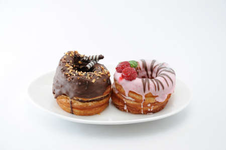 sweet chocolate almond and strawberry cake doughnuts on a plate white background