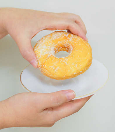 Food and Bakery, Hand Holding Delicious Fresh and Sweet Donut with Sugar Toppings on White Dish.