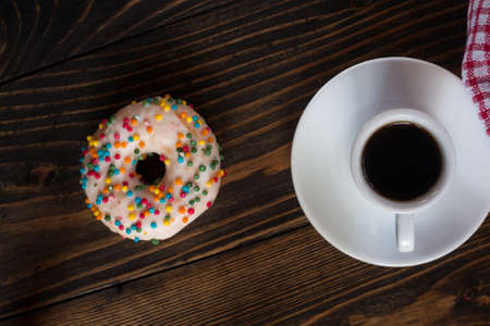 Sweet donut with white frosting and cup of fresh coffee on wooden table, top view