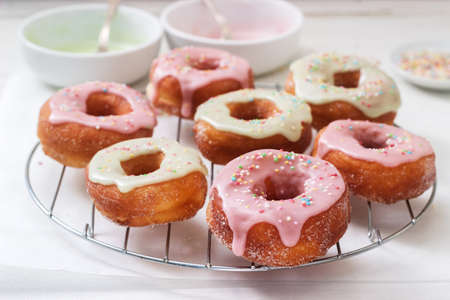 Homemade donuts decorated with colored icing and colored sugar on a light background. Selective focus.