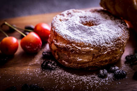 Cronuts are a croissant and donut mixture with vanilla custard and berries on dark background.