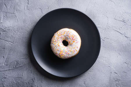 Vanilla donut with sprinkles on black plate, sweet glazed dessert food on concrete textured background, top view