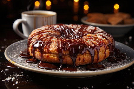 A freshly made donut covered in powdered sugar rests on a plate, accompanied by a steaming cup of coffee. The warm light creates a cozy atmosphere, enhancing the inviting scene.