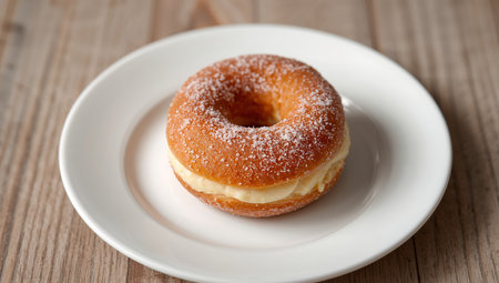 Eyelevel view of a goldenbrown, round, creamfilled pastry, covered in granulated sugar, sitting on a white plate, set on a rustic wooden surface.